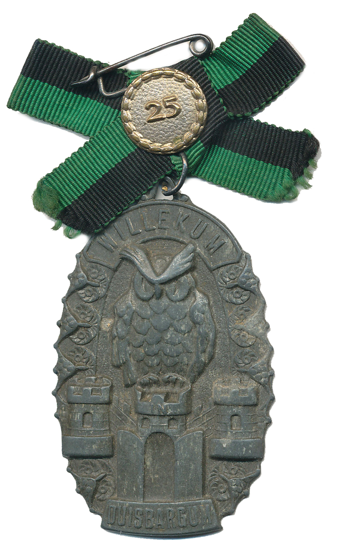 Duisburg (Duisbargum) - Uvítací odznak, ovál s výrem sedícím na 3 věžích, nahoře stuha VILLEKUM, věnec tvoří hlavy výrů Zn plech 63x40 mm_ouško se stuhou s terčem a číslem 25