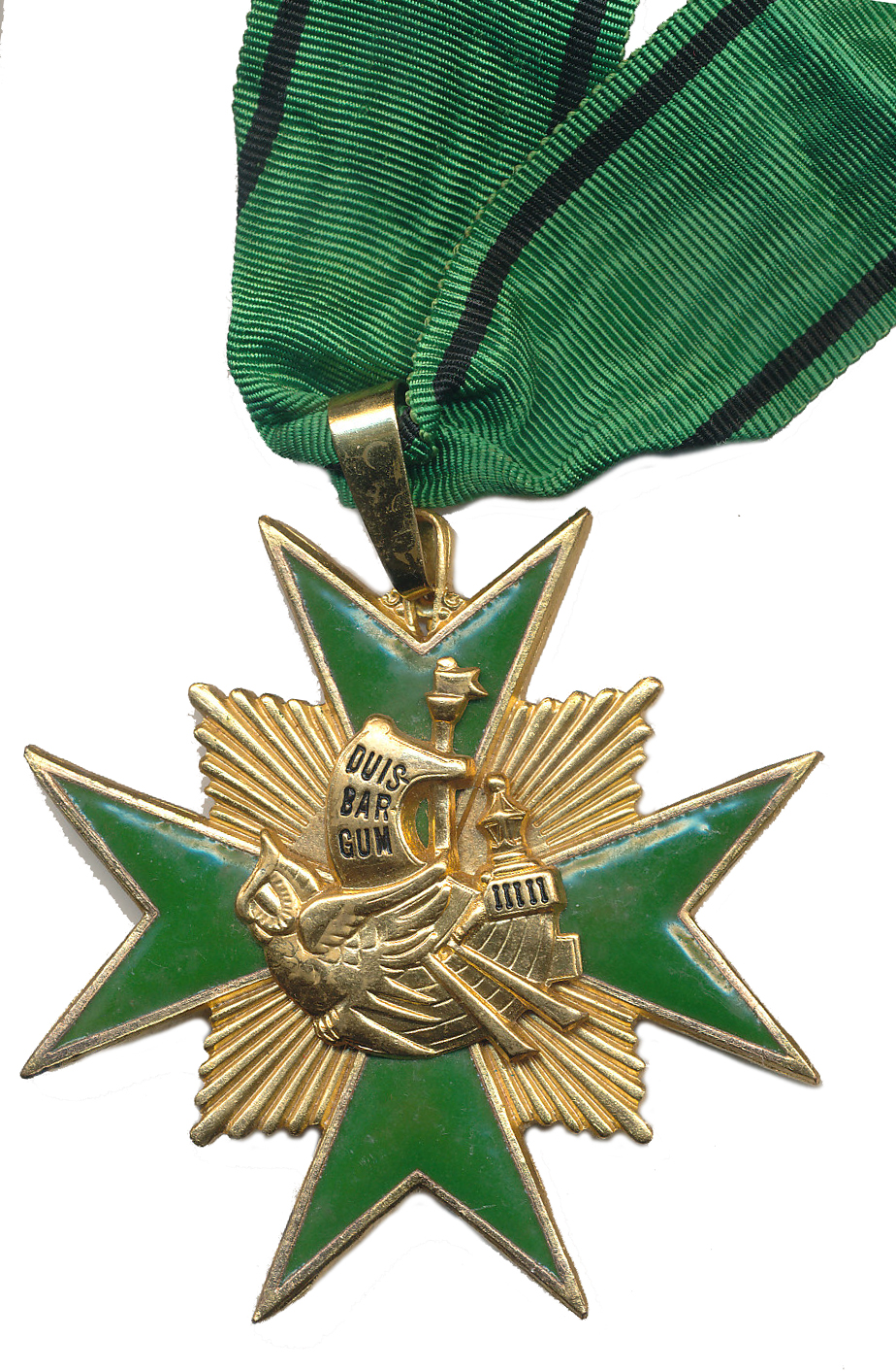Duisburg (Duisbargum) - Domácí řád I.tř., Pozlac.zelený smaltovaný maltézský kříž se zlatavými mezipaprsky, ve středu zlatý výr v podobě plachetnice, nápis na plachtě 71x70 mm_ouško se závěsem a náprsní stuhou