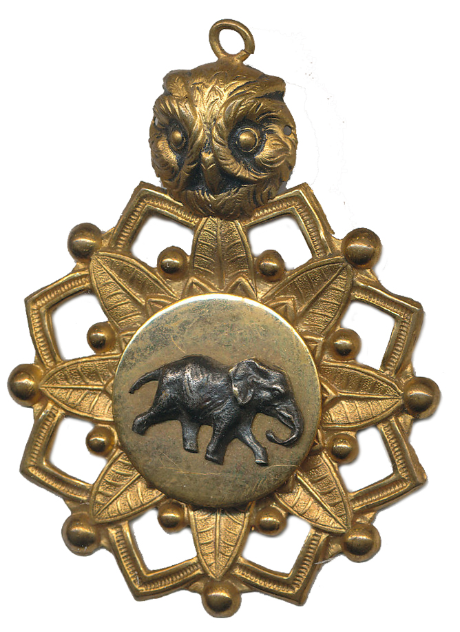 Elberfeld u Wuppertalu (Elberfeldensis) - 8cípá pozlac.hvězdice z listoví a provazcem s kuličkami, v kruhovém středu stříbrný patinov.slon, pevný závěs s hlavou výra, Plech 73,5x55 mm_ouško