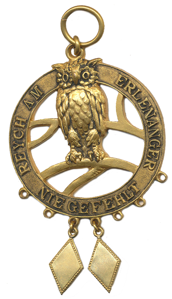 Erlangen (Am Erlenanger) - odznak Za vzornou docházku, zlatý výr na větvích obtočen stuhou s opisem REYCH AM ERLENANGER, NIE GEFEHLT, dole 2 přívěsky, Pozlac.bronz 43,6 mm_ouško