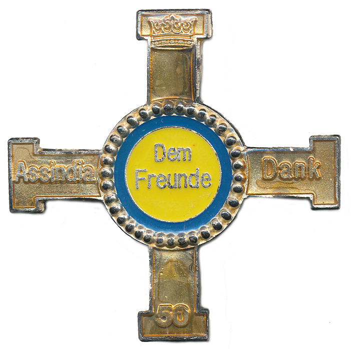 Essen (Assindia) - odznak přátelům, Pozlac.lakovaný berličkový kříž, nahoře koruna, dole 50, vodorovně ASSINDIA DANK, ve středu žluté pole s nápisem DEM / FREUNDE s modrým okružím, Bílý kov 56x56 mm