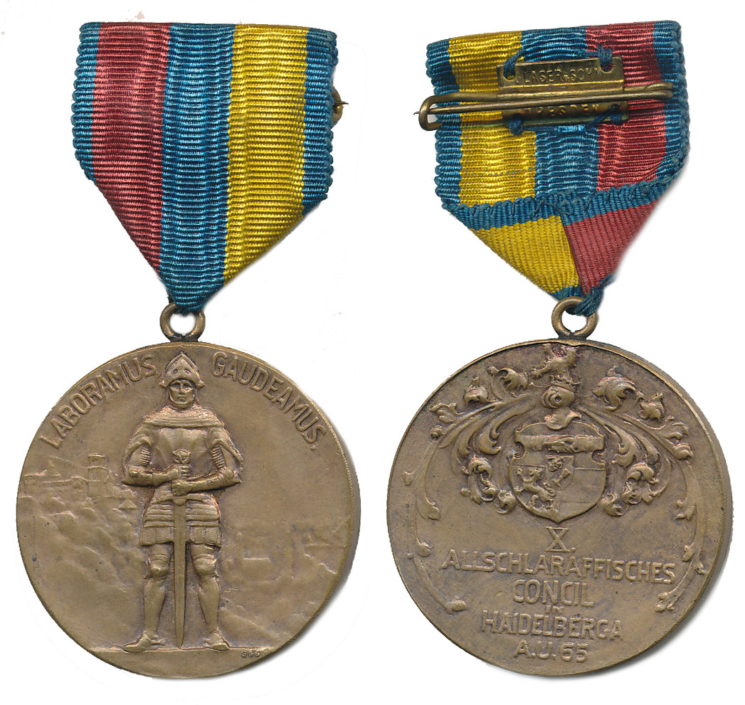 Heidelberg (Heidelberga) - medaile X.koncilu Allschlaraffie 1924 Postava rytíře s mečem, za ním panorama, opis LABORAMUS GAUDEAMUS / pod znakem nápis X. / ALLSCHLARAFFISCHES /KONCIL, Bronz 40 mm_ouško se stuhou