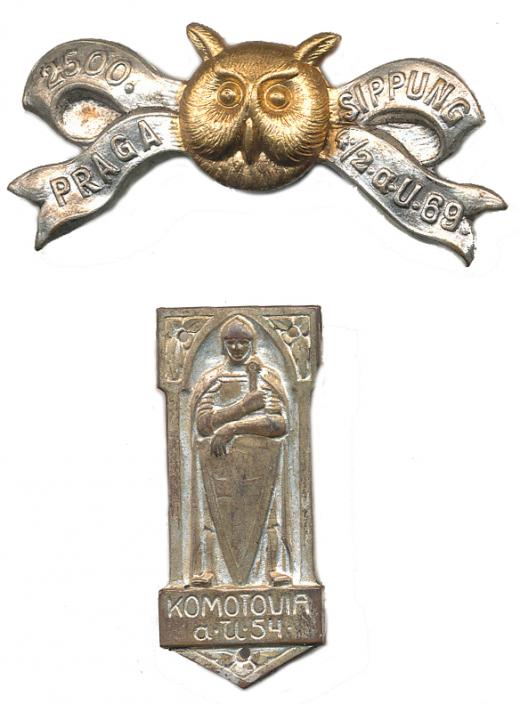 Chomutov (Komotovia) - Ahnen (čepicový odznak) KOMOTOVIA a.U. 54, chomutovský rytíř, Bílý plech 36,5x15,5 mm Praha (Praga) - Ahnen (čepicový odznak) PRAGA. 2500 SIPPUNG . /a.U. 69 (1928), zlatá hlava výra s mašlemi, Plech 22x48 mm_vod.záv.jehlice