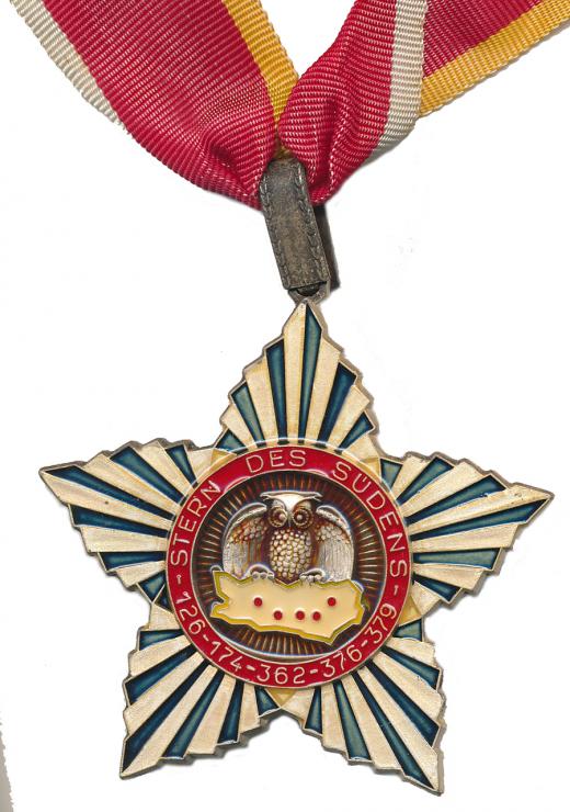 Klagenfurt (Claudium Forum) - Řád hvězdy jihu, bílo-zelená paprsčitá 5cípá hvězda, ve středu výr s mapou, opis v červeném mezikruží STERN DES SÜDENS - 126 - 174 - 362 - 376 - 379 (značí spolkyVillach atd.), Bílý kov 69x69 mm_ouško se závěsem a nákrční dekorací