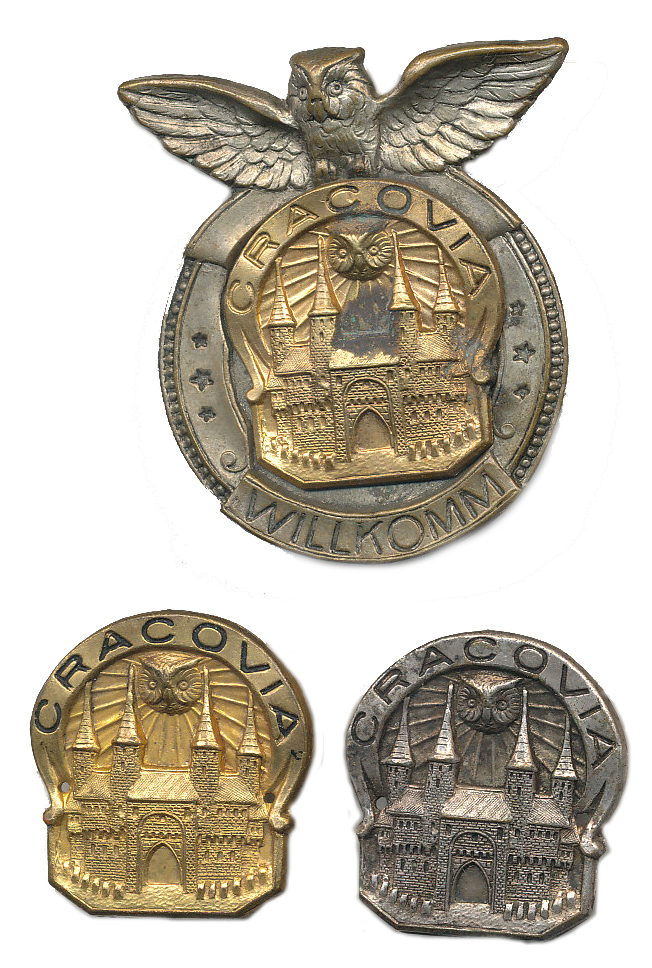 Krakov (Cracovia) - Uvítací odznak, výr drží zlacený barbakan s opisem CRACOVIA, dole szuha WILLKOMM, Plech 44x35 mm_svislá zap.jehlice Ahnen (čepicový odznak) - barbakan, Pozlac., Postř. 26x24 mm - 2x_celk.3 ks