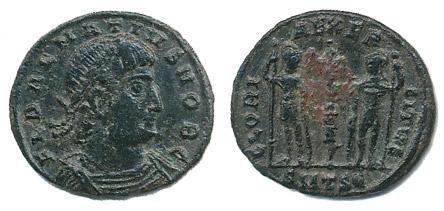 AE3/4, Rv:"GLORIA.EXERCITVS.", dva vojáci se standartou minc.Thesalonica, 5.dílna - ražba z let 336 - 37, S.3831, C.4