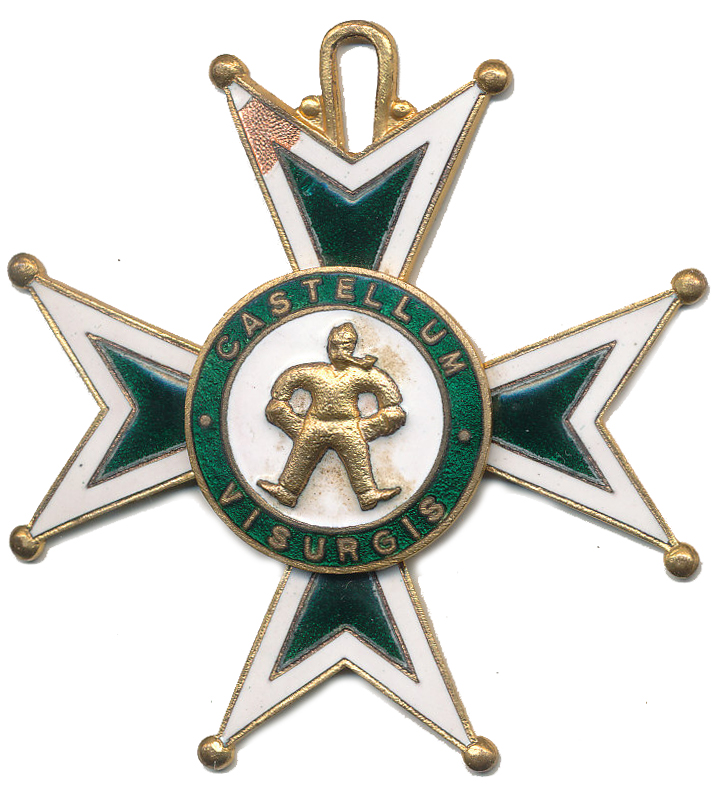 Vegesack - část Brém (Castellum Visurgis) - Řád chudoby, Pozlac.zeleně smaltovaný bíle rámovaný maltézský kříž, ve středu zlatý muž s prázdnými kapsami v bílém poli, zelený mezikruží s opisem,63,5x60,5 mm_dr.poškoz.smalt ouško