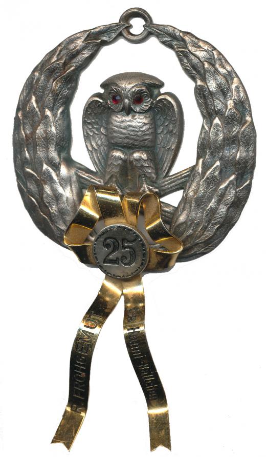 Čestný řád Verbandu Allschlaraffie k 25.výr. rytíře Frohgemut das Hanni-Bällchenn, tmavě stříbrný výr v neuzavřeném věnci, dole stuha s číslicí a jménem 71x70 mm_ouško
