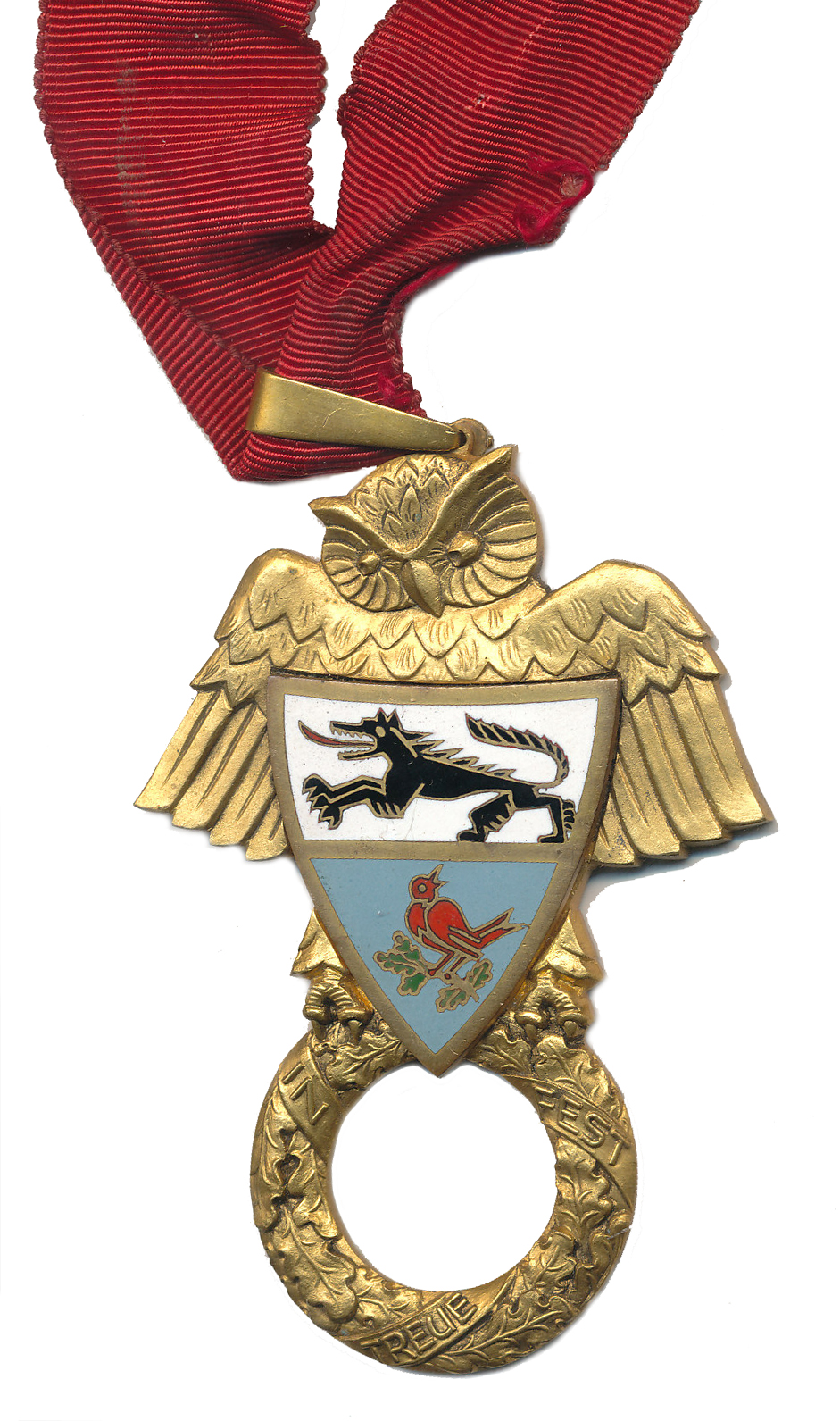 SCHLARAFFIA - neurčeno, pozlac.výr s městským znakem na prsou drží zlatý dubový věnec s opisem Z - FEST - TREUE, 87x61 mm _závěs s nákrční stuhou