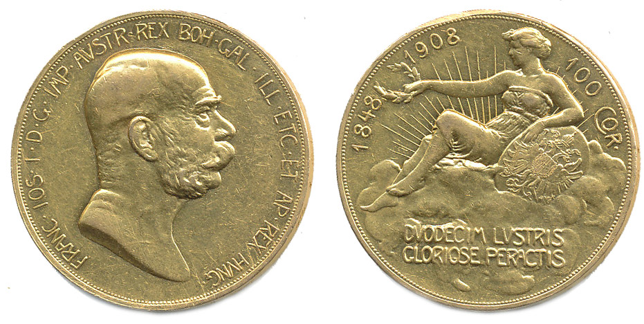 100 Koruna 1908 jubilejní_dr.hr. tém.