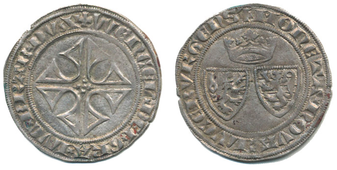 Groš b.l. (ražba v Lucembursku), ozdobný kříž, opis / pod korunou český a lucemburský lev ve znaku proti sobě, opis Pr.168 (149), Weiller.147_R!