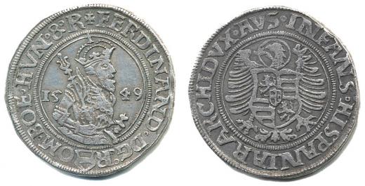 1/2 Tolar 1549, Jáchymov-Puellacher, J.35, MKČ.127, Do.1179, Ma.906 var. v opisu av.: místo "REX" je "R", v rev.: ARCHIDVX.AVS. _dr.hr. R!