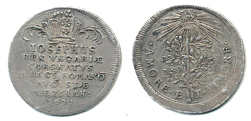 Menší peníz na korunovaci na římského krále, 26.1.1690 v Augsburgu, meč ovinutý vavřínovou ratolestí, opis / pod korunou 7řádk.nápis, Nesign., Ag 20 mm, 1.89 g, Nov.X/B-35b, Mo.1232, Ho.2422