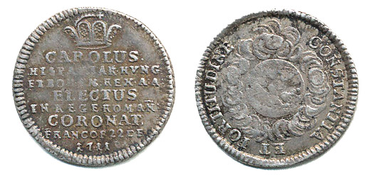 Menší peníz na korunovaci na římského císaře ve Frankfurtu 22.12.1711 Pod korunou 8řádk.nápis / zeměkoule v oblacích, opis, Nesign., Ag 20 mm, 2.07 g, Nov.XI/F-47b, Mo.1368_dr.ned. R!