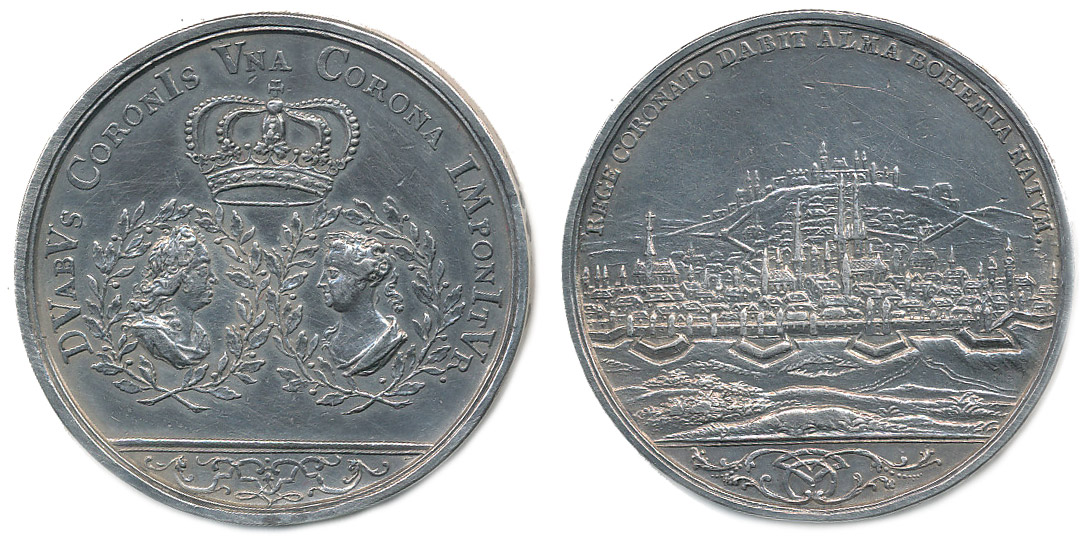 Vestner - větší medaile na českou korunovaci manželů, 1723 Koruna, dva portréty ve věnci proti sobě, opis / pohled na Prahu, opis, letopočet chronogramem, Nesign., Ag 44 mm, 29,13 g,ČS.1131, Nov.XI/FF-3a, LG.XV/818, Mo.1585_dr.rysky v rev. R!