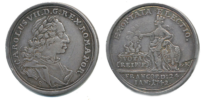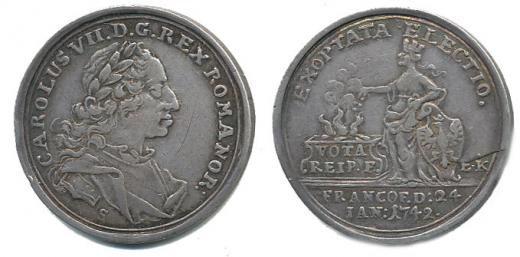 Medaile na volbu za římského císaře 24.1.1742 Poprsí císaře zprava, opis / patronka města s korunou na hlavě vkládá pravou rukou oběti do zapálené obětní misky na oltáři, opisSign.S., Ag 26 mm, 6,36 g, Nov.XII/B-28b, JF.738_R!