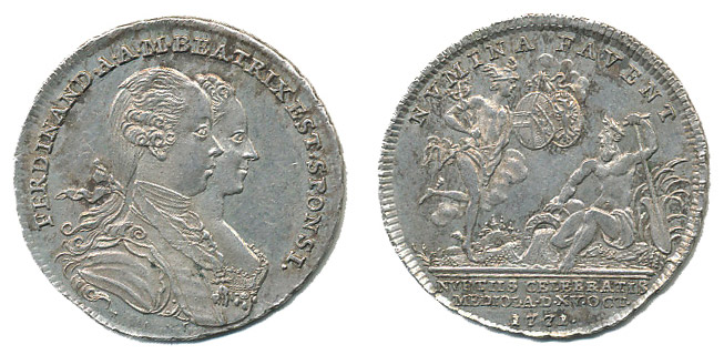 A.Wideman - medaile na sňatek arcivévody s Marií Beatrix d´Este Dvojportrét zprava, opis / řádk.nápis v úseči 15.10.1771, Nesign., Ag 25 mm, 3,99 g, Mo.2035, LG.XIV/267, We.8038, SD.239b
