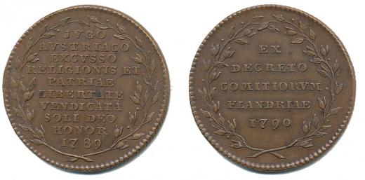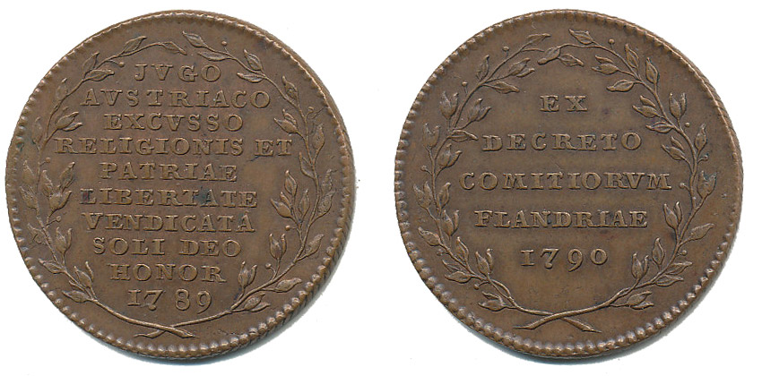 Žeton na nezávislost Flander 1789/1790#Br 10řádk.nápis ve věnci / 5řádk.nápis ve věnci Bronz 33 mm, 12,12 g, Mo.2197 (Ag), Ho.3178 (Ag), LG.XIV/1068
