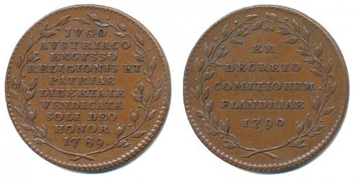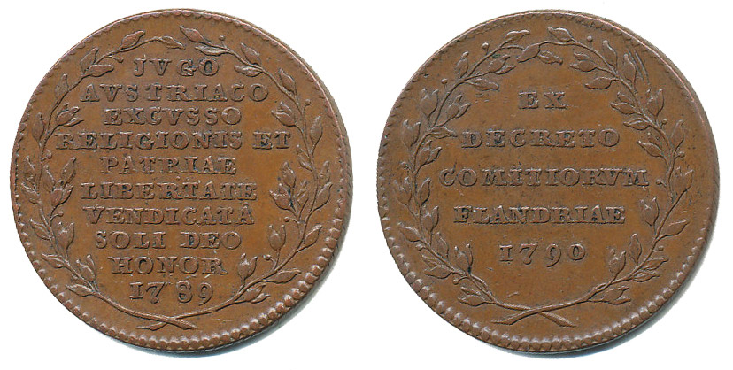 Žeton na nezávislost Flander 1789/1790#Br 10řádk.nápis ve věnci / 5řádk.nápis ve věnci Bronz 33 mm, 12,12 g, Mo.2197 (Ag), Ho.3178 (Ag), LG.XIV/1068_tém.