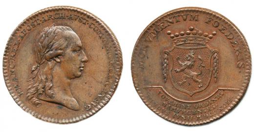 Medaile na holdování v Namuru, 1792#Br Portrét zprava, opis / korunov.znak, opis, 3řádk.nápis v úseči Nesign., Bronz 34 mm, Nov.XVII/F-1c, LG.XIV/1185_R!