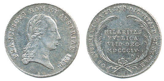 Menší peníz na vyhlášení Rakouského císařství 1804 Portrét zprava, opis / 4-řádk. nápis ve věnci, opis, Nesign., Ag 20 mm, 2.15 g, ČS.1480, Mo.2337, Ho.3380, LG.XII/2