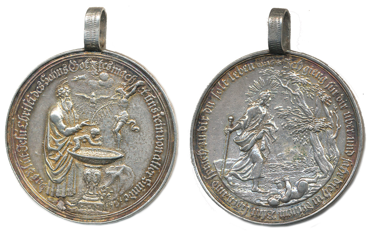 P.H.Müller - kráčející Kristus v krajině, na zemi ležící dítě pod stromem, opis / Bůh otec křtí dítě, Kristus a kříži, Duch svatý, opis Sign. (z let 1690 - 1718), Ag 48 mm, 26.36 g_dob.ouško