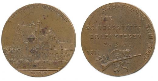 Německo - Nürnberg (Norimberk) - hlavní střelecký spolek - na otevření nové střelnice 7.-8.Mai 1911, pohled na budovu střelnice, nápis v úseči, opis / 5řádk.nápis se střelekými atributy, opisSign.Balmberger, Bronz 40 mm