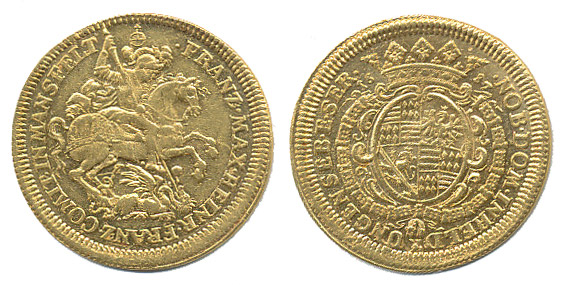 Dukát 1687, korunovaný knížecí znak, opis / Svatý Jiří na koni zabíjí draka, KM.135, Fr.1514_RR! tém.
