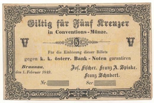 Broumov (Braunau), 5 Krejcar 1.2.1849, J.Fischer, F.A.Spiske, F.Schubert, bez čísla série a podpisu, V-R.140.02.02a