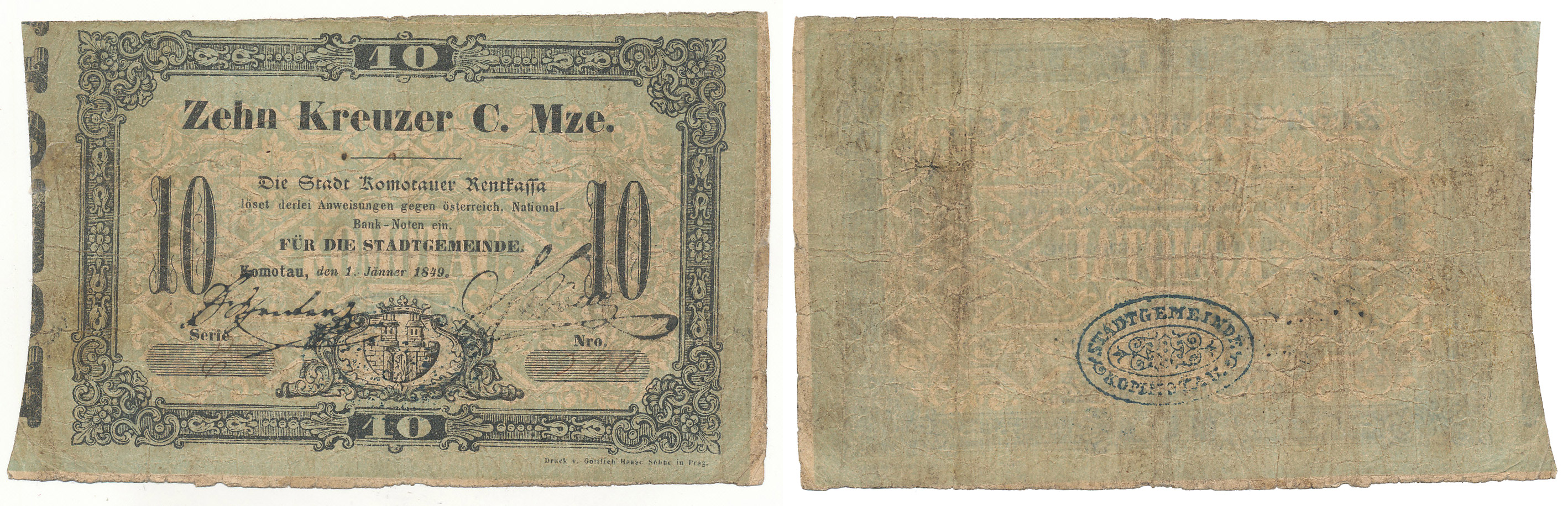 Chomutov (Komotau), 10 Krejcar 1.1.1849, Stadtgemeinde sér.b, čís.:580, V-R.220.19.01.b.II_malá nálepka u okraje