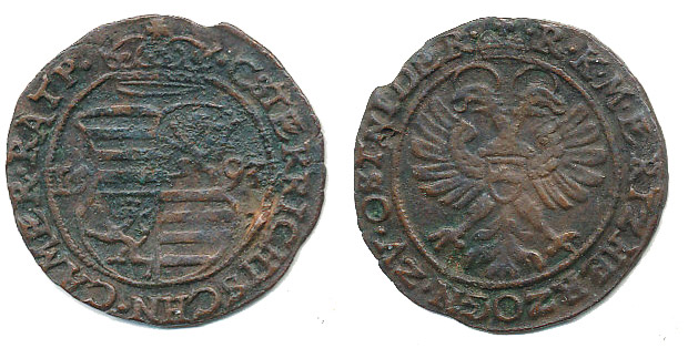 Početní peníz 1593, Rakousy -Vídeň, Huebmer 4dílný znak, opis / dvouhlavý orel, opis, Prokisch.A.3/1/78