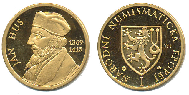 L.Charvát - medaile Jan Hus 1369 - 1415, b.l. Punc., ryz.999,9, Au 25 mm, 7,15 g, čís.: 771 ze sady Národní numismatická epopej I._orig.kapsle