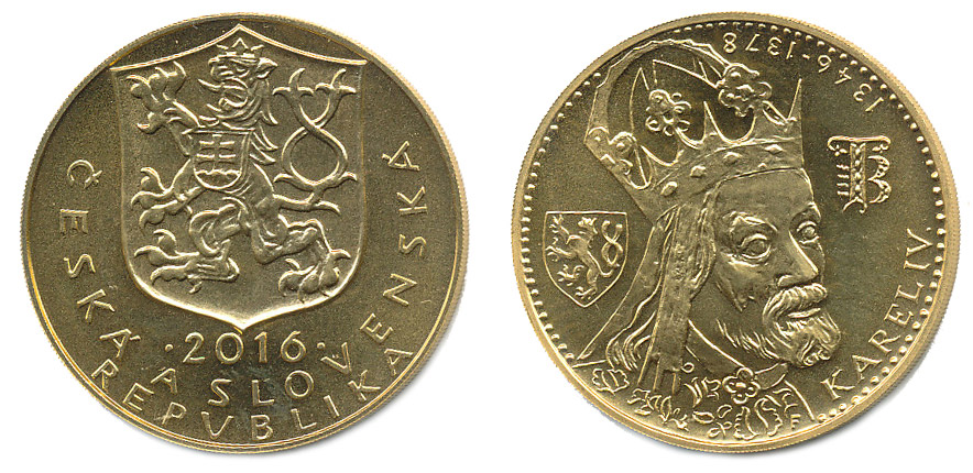 5 Dukát - k 700.výr.narození Karla IV. 1316 - 2016 Portrét čelně mírně zprava (vzor dukát 1978) / čs.znak, opis Česká a slovenská republika, ryz.986, 34 mm, 17,45 g, náklad 80 ks, čís.75minc.Kremnice_orig.etue se smalt.českým lvem + certifikát