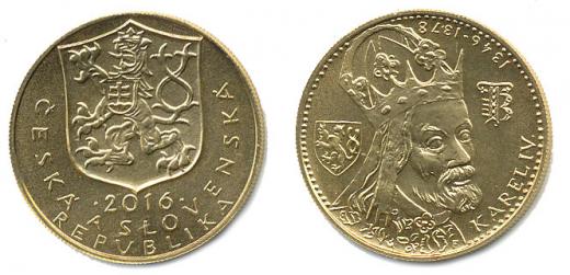 2 Dukát - k 700.výr.narození Karla IV. 1316 - 2016 Portrét čelně mírně zprava (vzor dukát 1978) / čs.znak, opis Česká a slovenská republika, ryz.986, 25 mm, 6,98 g, náklad 100 ks, čís.76minc.Kremnice_orig.etue se smalt.českým lvem + certifikát