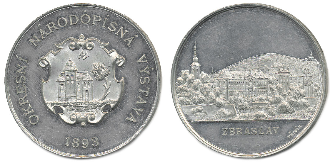 Přibík - okresní národopis.výstava na Zbraslavi, 1893#Sn Pohled na klášter, nápis / znak města v ozdob.katruši, opis Sign., Sn 45 mm, Haus.3747, Unger.2595, Ho.6507