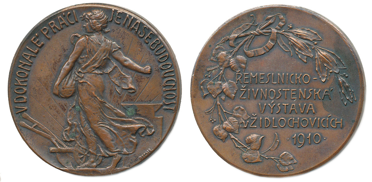 Pichl - řemeslnicko - živnostenská výstava 1910 Stojící alegorická ženská postava zleva, opis / 5řádk.nápis v ozdobném věnci, Sign., Cu 50,5 mm, 62,95 g_R!