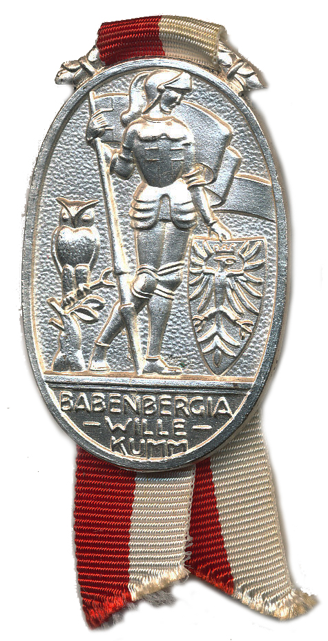 Bamberg (Babenbergia) - Uvítací řád, v oválu rytíř s praporcem a štítem, výr, dole nápis BABENBERGIA / WILLE / KUMM Postř. 51x33 mm_se stuhou