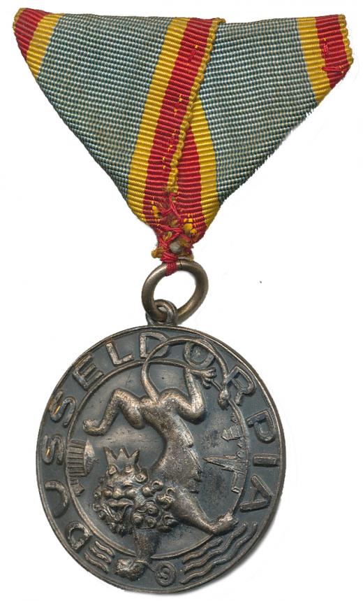 Düsseldorf (Dusseldorphia) - Uvítací medaile, nad vedutou města korunovaný lev, na tlapě píssmeno "S", opis v mezikruží DUSSELDORPHIA Postř.bronz 40 mm_ouško se stuhou