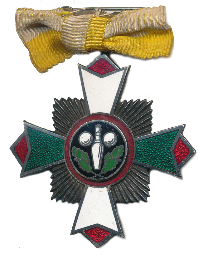 Kuželkářský spolek b.l., zeleno-bíle smaltov.maltézský kříž s červenými hroty, mezipaprsky, ve středu kuželka se zkříženými ratolestmi 56x53 mm, v rev.věnování 28.3.1930_se stuhou
