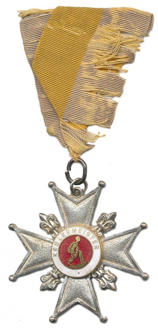 Kuželkářský spolek b.l., stříbřitý kříž s liliemi mezi rameny ve středu zlatý chodeb v červeném poli, bílé mezikruží s opisem KEGLERMEISTER 50x50 mm_ouško se závěsem a stuhou