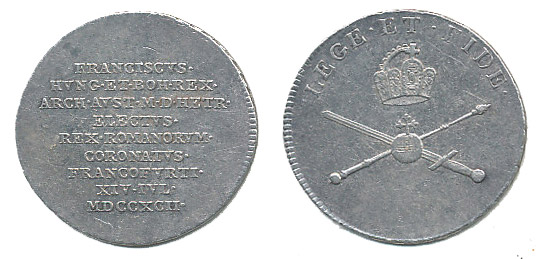 Menší peníz na korunovaci ve Frankfurtu, 14.VII.1792 Koruna, žezlo, meč a jablko, opis / 9-řádkový nápis, Nesign., Ag 20.5 mm, 2.16 g, Nov.XVII/E-8b, Mo.2270, Ho.3334