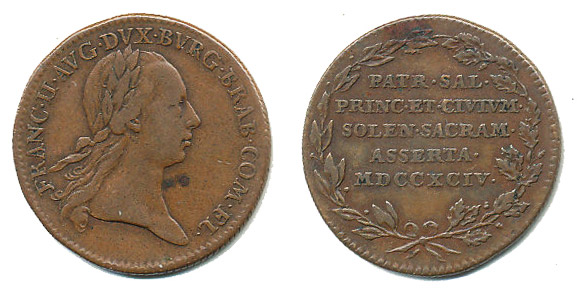Menší peníz na holdování v Belgii (Brusel) 1794 Portrét zprava, opis / 5řádk.nápis Bronz 22 mm, Nov.XVII/M-6c, LG.XIV/1219, Mont.-_R!