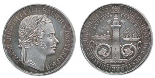 2 Tolar spolkový 1857 A - Jižní dráha, znač.CR (K.Radnitzky) _vroubkovaná hrana - replika - neznačeno, 30,40 g