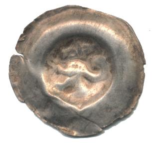 Brakteát moravský z let 1278-1300, Ca.1002, F.XXXI/52 _dr.napr.okraj, mělká ražba