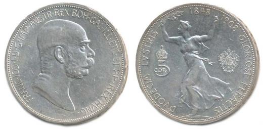5 Koruna 1908 b.zn. - jubilejní_tém.