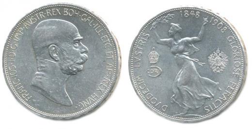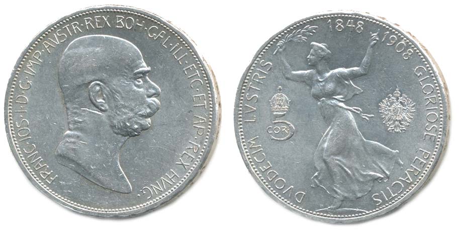 5 Koruna 1908 b.zn. - jubilejní_vl.rysky v av. tém.
