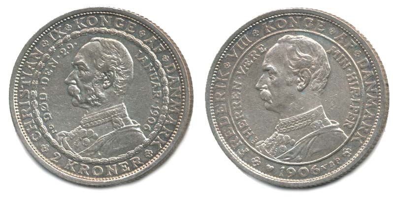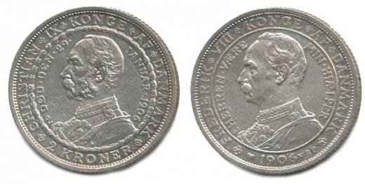 2 Koruna 1906 - úmrtní, portrét Christiána IX. zleva, opis / portrét Frederika VIII. zleva, opis, KM.803_tém.