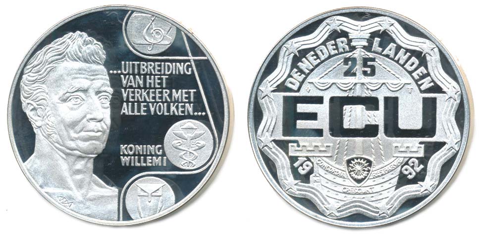 Nizozemí, 25 Ecu 1992 - král Wilhelm I., Ag 925/1000, 25 g _kapsle