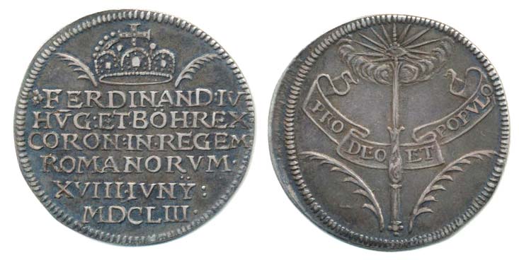 Velký jeton na korunovaci v Regensburgu, 18.VI.1653 Boží oko, žezlo, nápis na stuze / pod korunou 6řádk.nápis, Nesign., Ag 30 mm, 3,73 g, Mo.844, Ho.2020, Nov.VIII/D-7b, LG.II/473