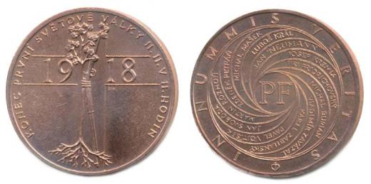Praha - PF 2018, konec první světové války 11.11. v 11 hodin Stromek lípy přivázaný k pušce / ve spirále jména 12 členů výboru Sign.Oppl, Cu 30 mm, 12,1 g, nákl. 13 ks, MF.C13/16c_R!